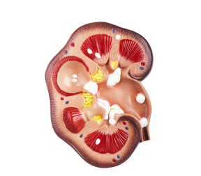 - Kidney stones Kidney stones are hard, pebble-like substances that form in the kidney when certain substances in the urine become highly concentrated. They can vary in size and shape, and they may be smooth or jagged. There are several types of kidney stones, including: